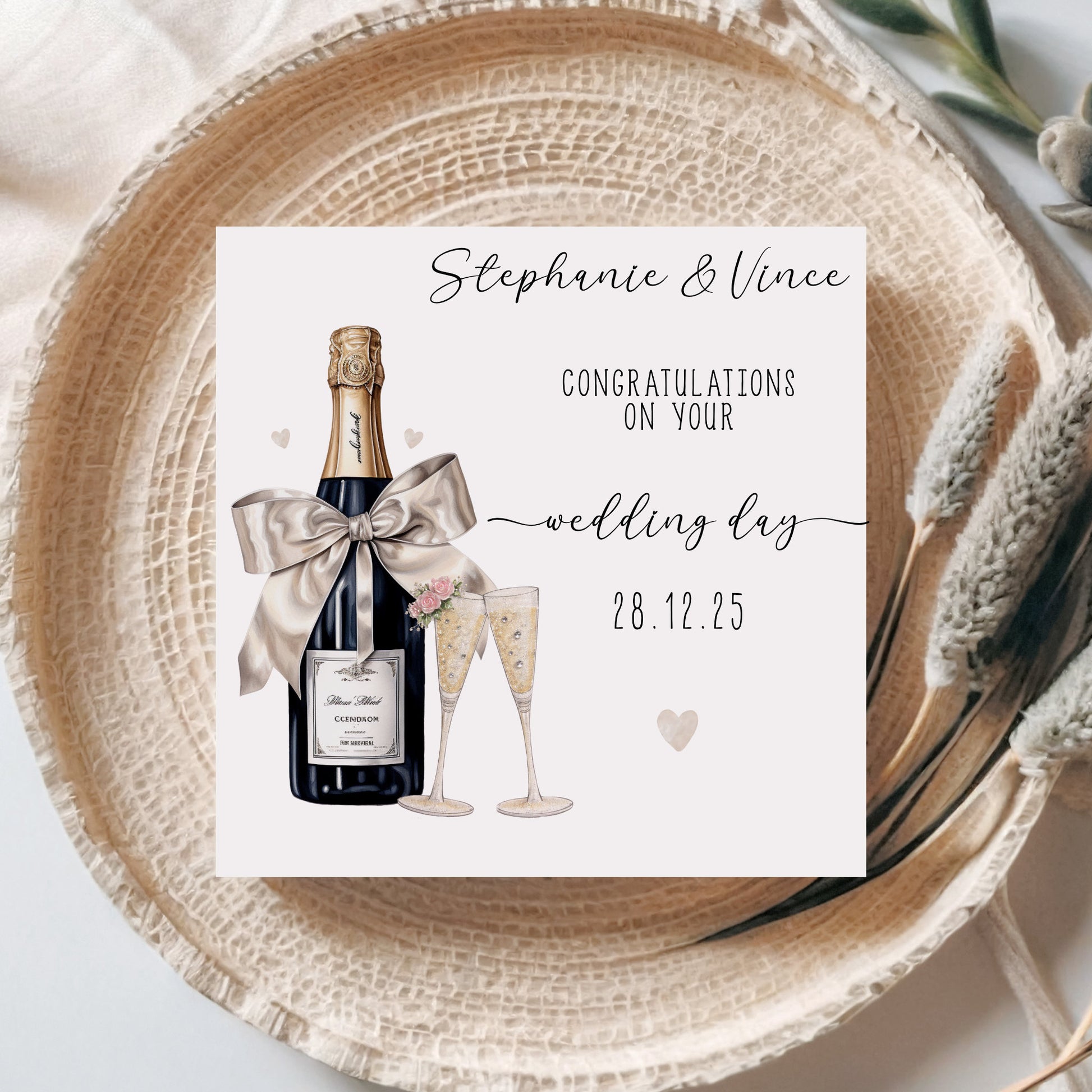 Celebrate a beautiful love story with this personalised Congratulations on Your Wedding Day card from Blossom Lane Cards. Featuring an elegant champagne bottle & flutes design, this wedding greeting card is the perfect way to congratulate the happy couple as they begin their new chapter together.