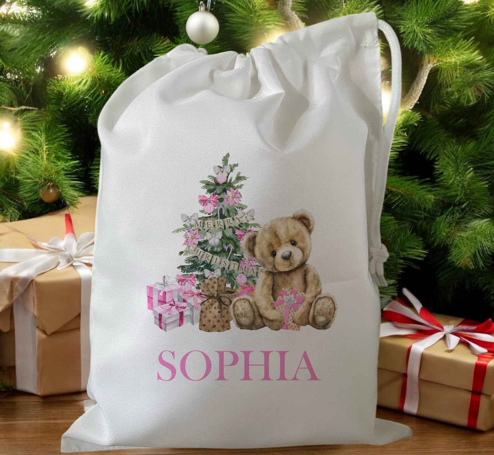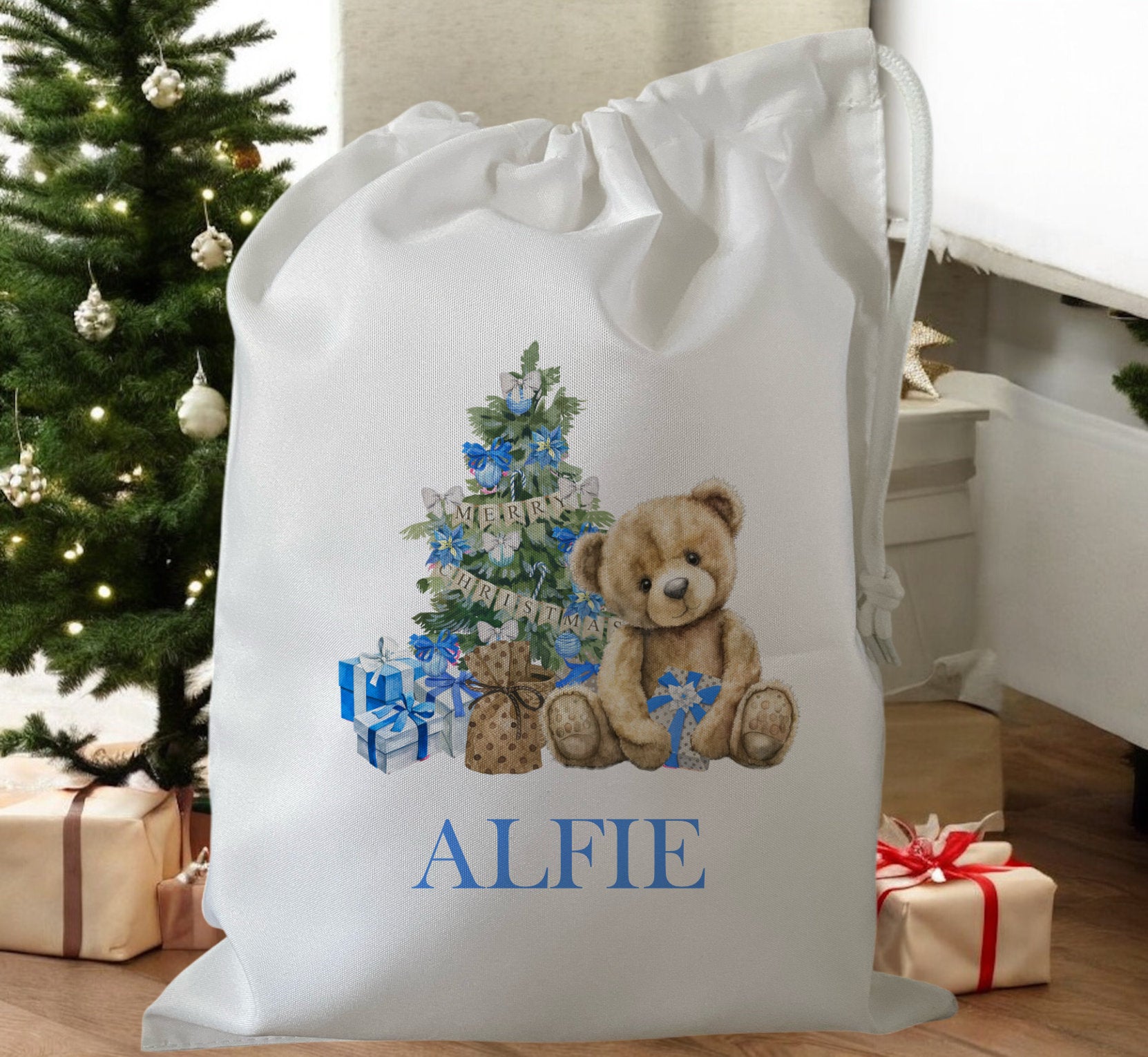 Peronalised Christmas Eve Treat Bag - Teddy Bear Blue, Pink, Red