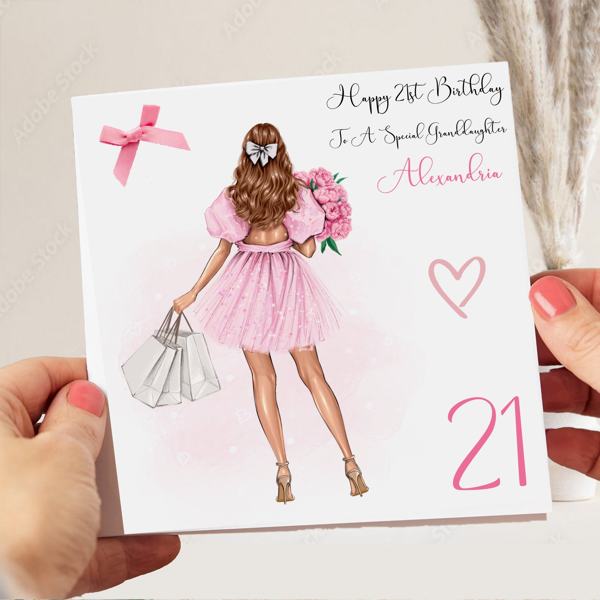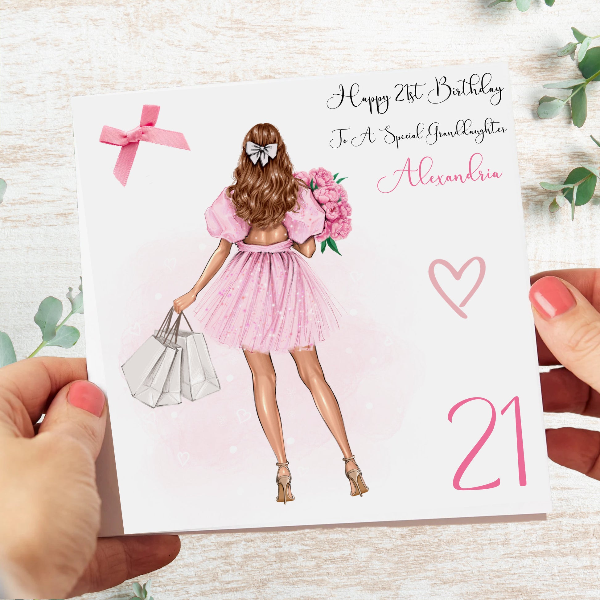 Personalised birthday card featuring a girl in pink dress holding flowers and shopping bags design.