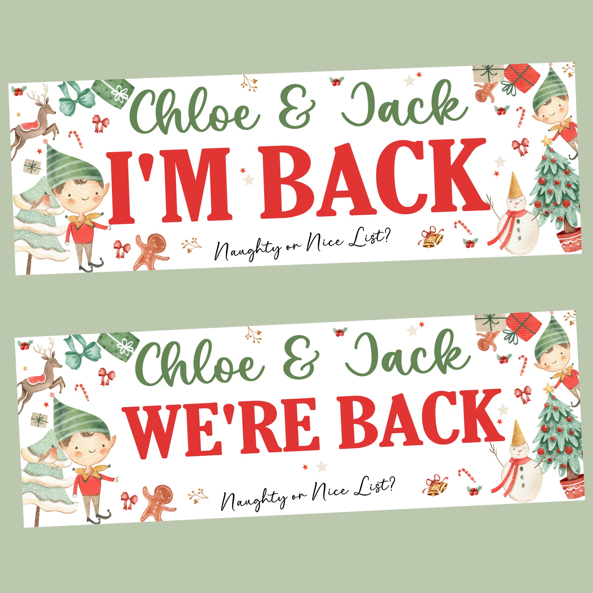 Personalised Christmas Elf ‘I’m Back / We’re Back’ Poster Banner – Custom Elf Return Prop Decoration