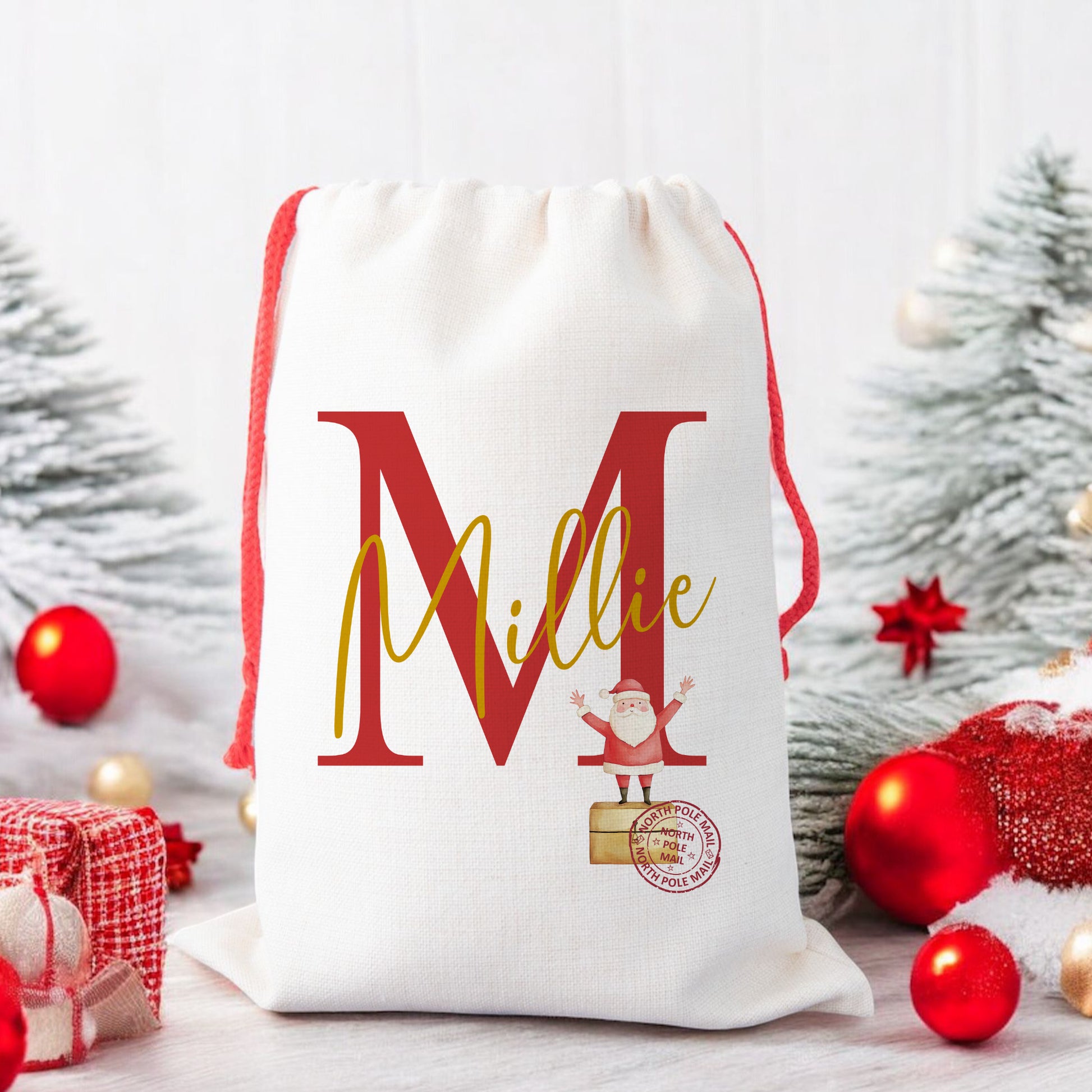 Personalised Christmas Santa Gift Sack – Red Initial & Santa Claus Design – Custom Name Christmas Sack for Kids