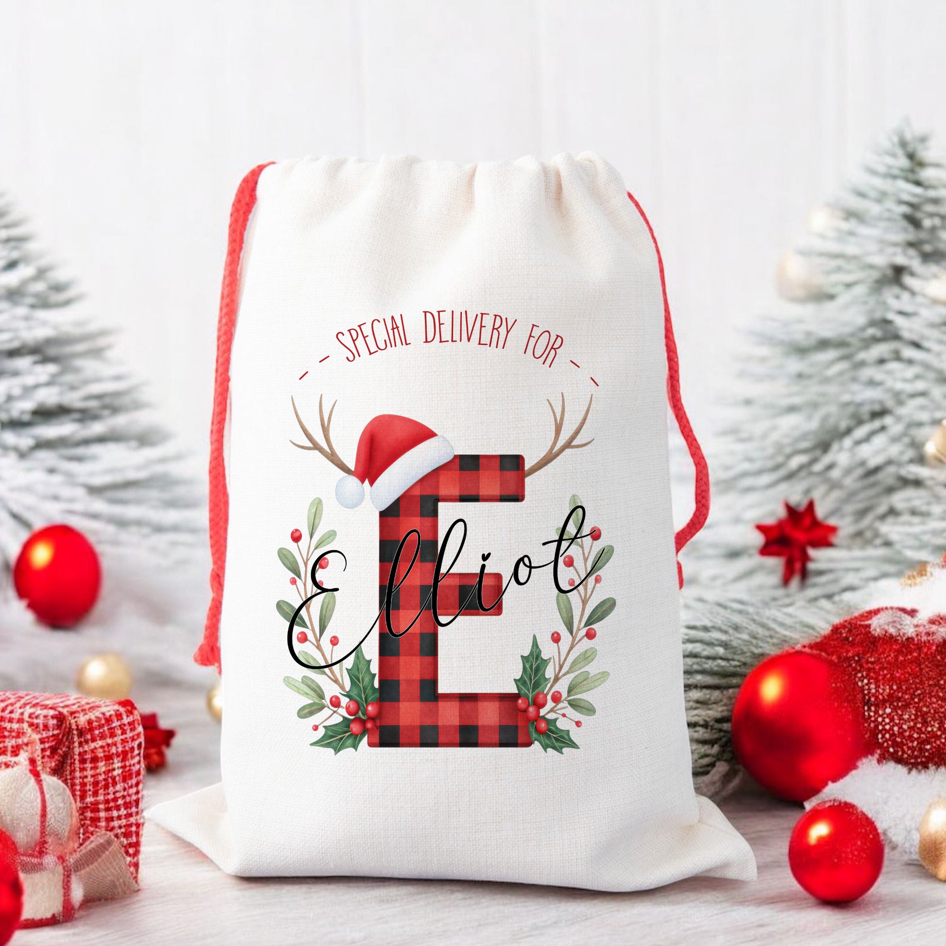 Make Christmas morning extra special with this Personalised Santa Sack, featuring a red and black plaid initial design with reindeer ears design. Perfect for children who love personalised gifts, this festive sack adds a personal touch and a sprinkle of magic to Christmas morning!