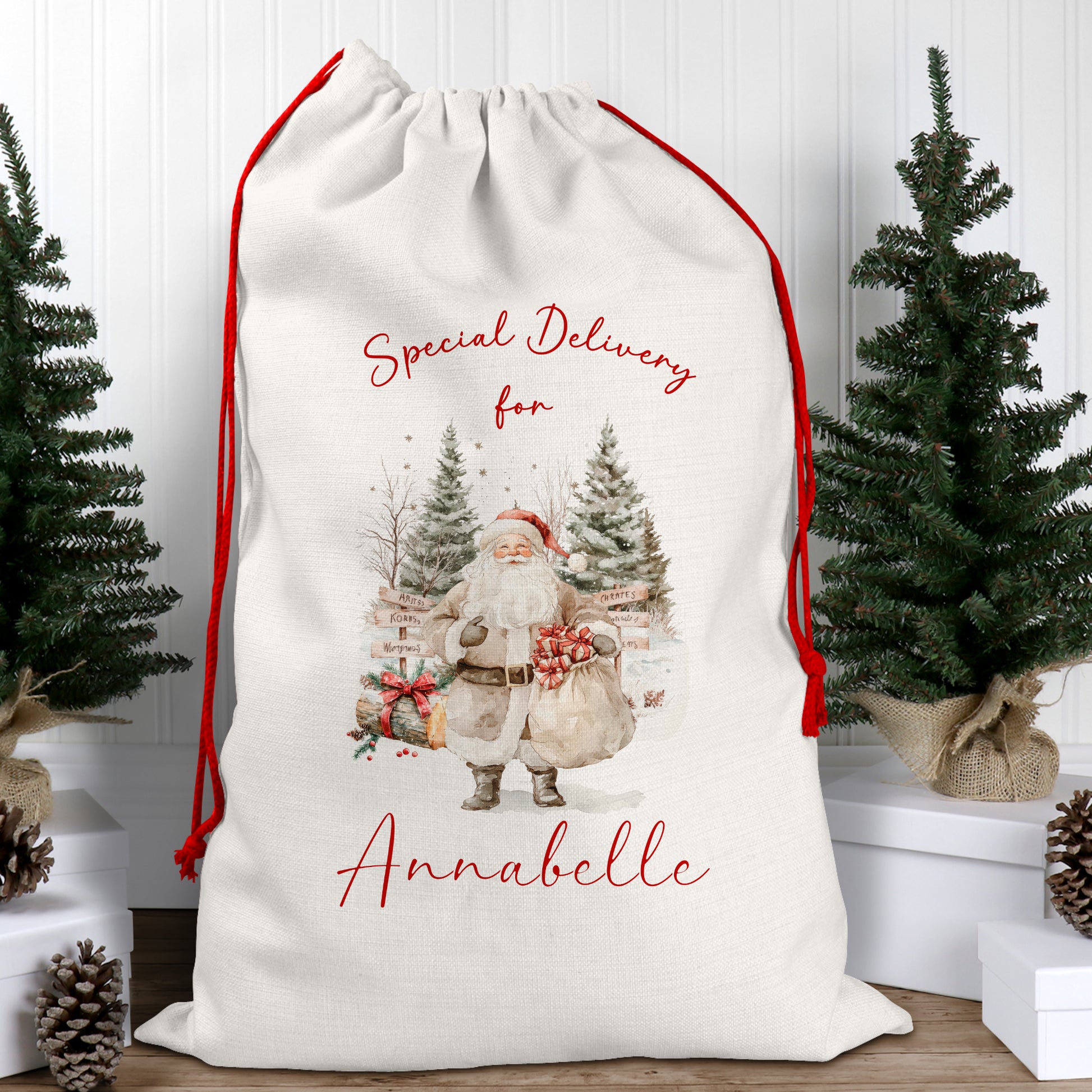 Printed with your child’s name each sack is made from high-quality, durable fabric with a strong drawstring closure—ideal for holding presents, stocking fillers, and Christmas Eve surprises. The vintage-style Santa artwork brings a cosy, nostalgic feel that looks stunning by the fireplace or under the tree.