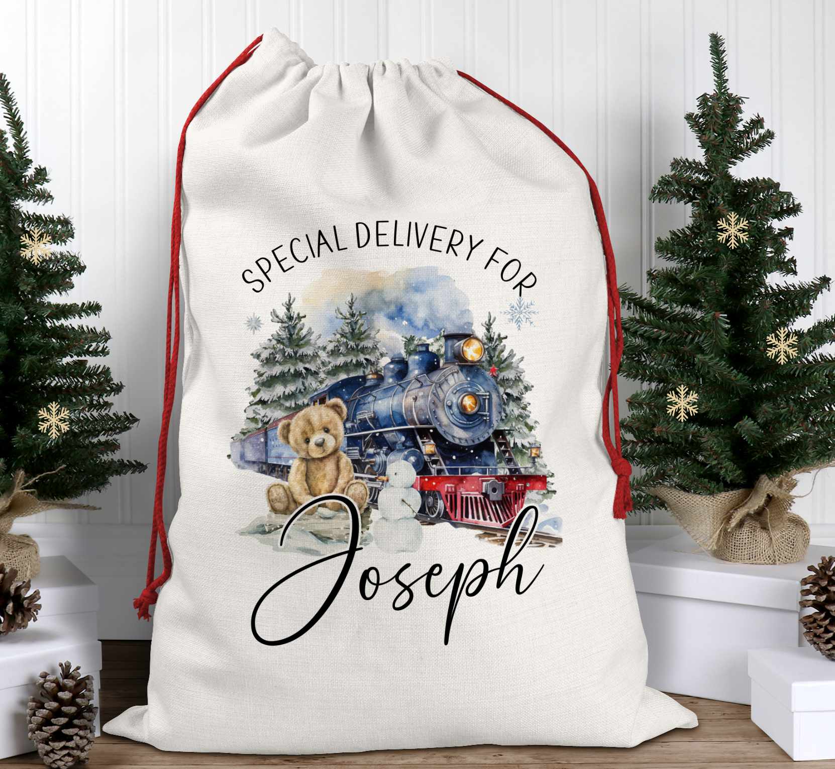 The playful design showcases a cute teddy bear and Christmas Express Train, adding a lovely touch to your holiday décor. Ideal for placing under the tree or next to the fireplace, this Personalised Santa Sack makes gift-giving extra special and memorable for children of all ages.