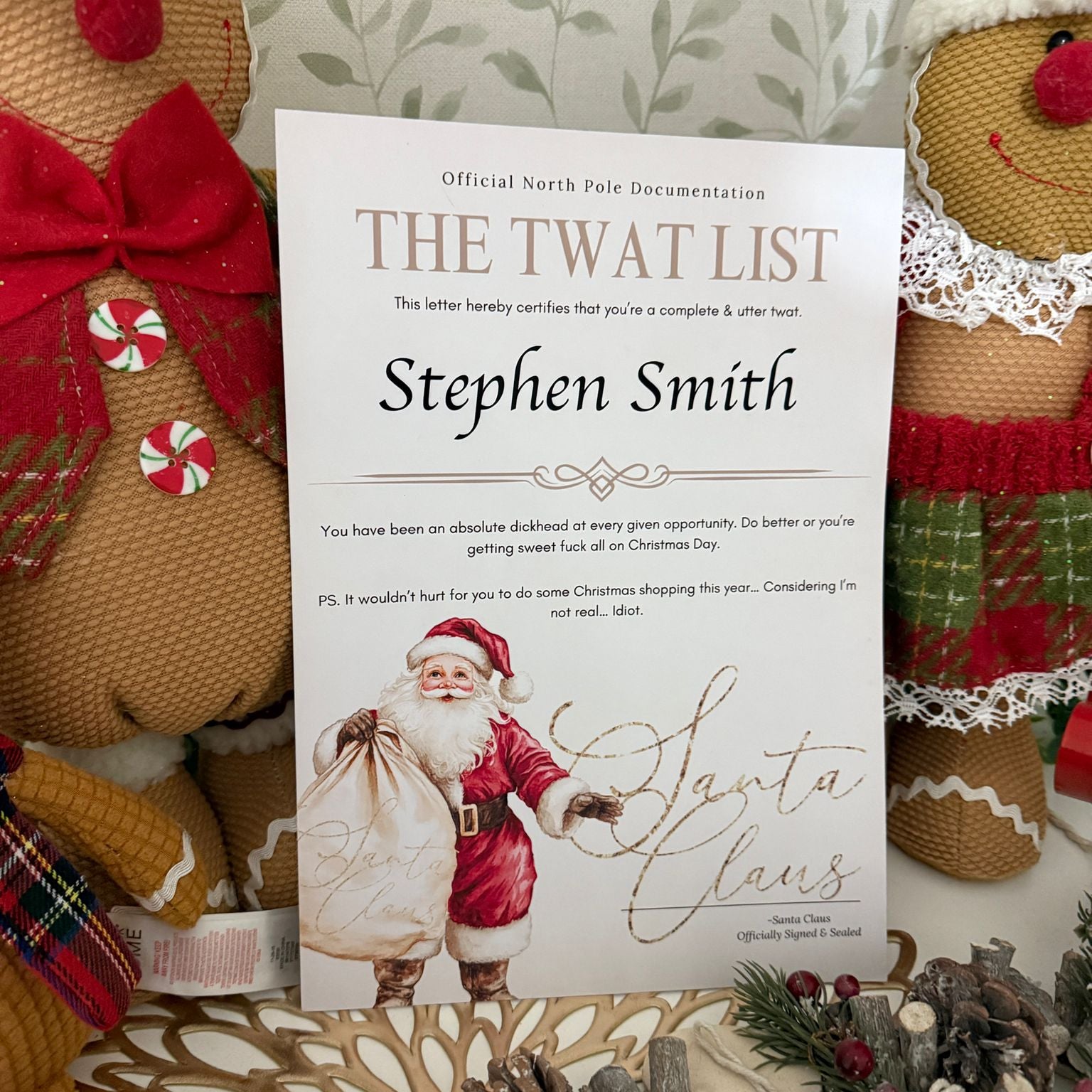 Featuring a fun Santa Claus design and printed on premium photo paper, each certificate is personalised with the recipient’s name and officially confirms their place on Santa’s infamous “Twat List” for the year. It’s the perfect novelty gift for Secret Santa, office parties, Christmas gatherings, or anyone with a wicked sense of humour.