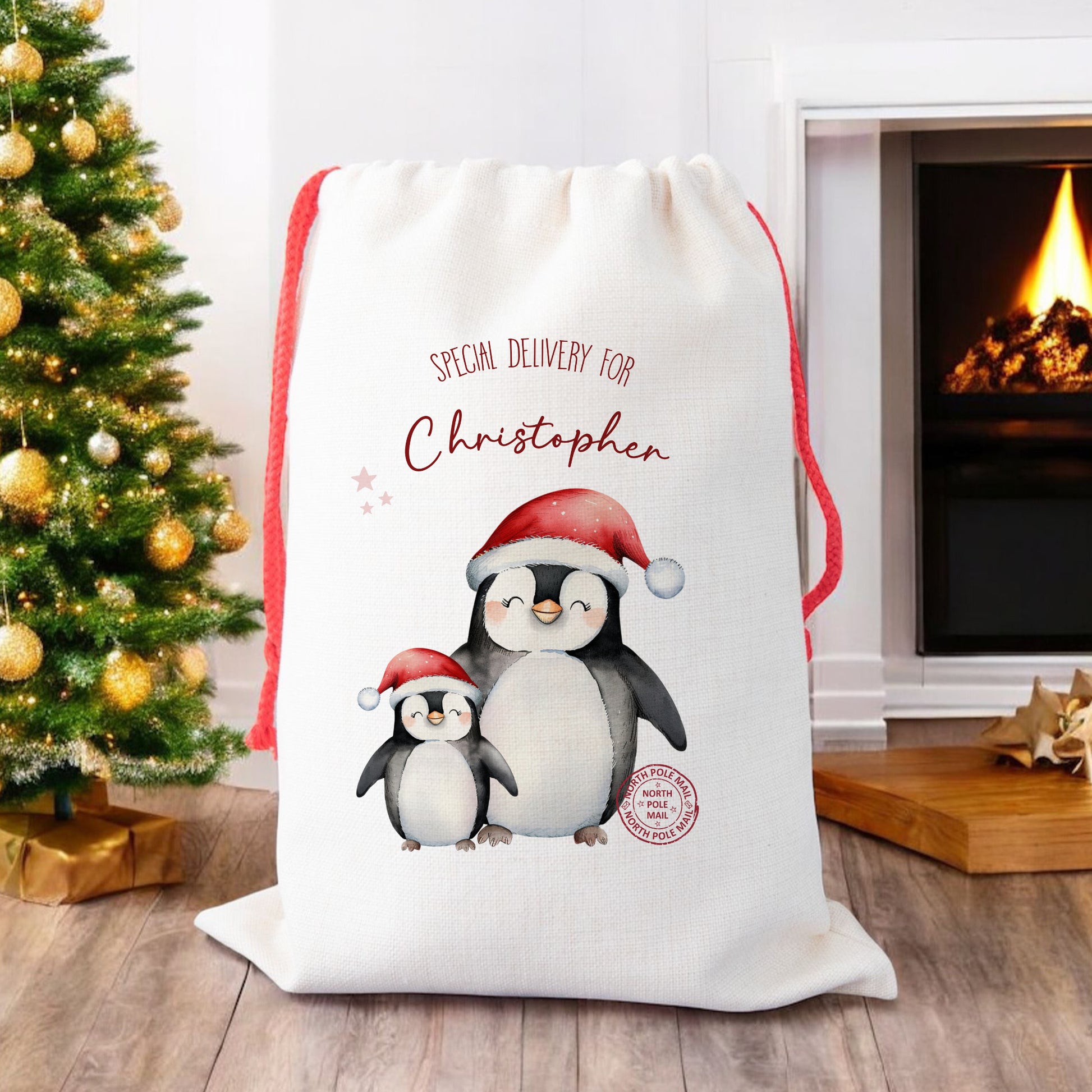 Personalised Santa Sack, Gift Sack for Kids or Adults, Penguins