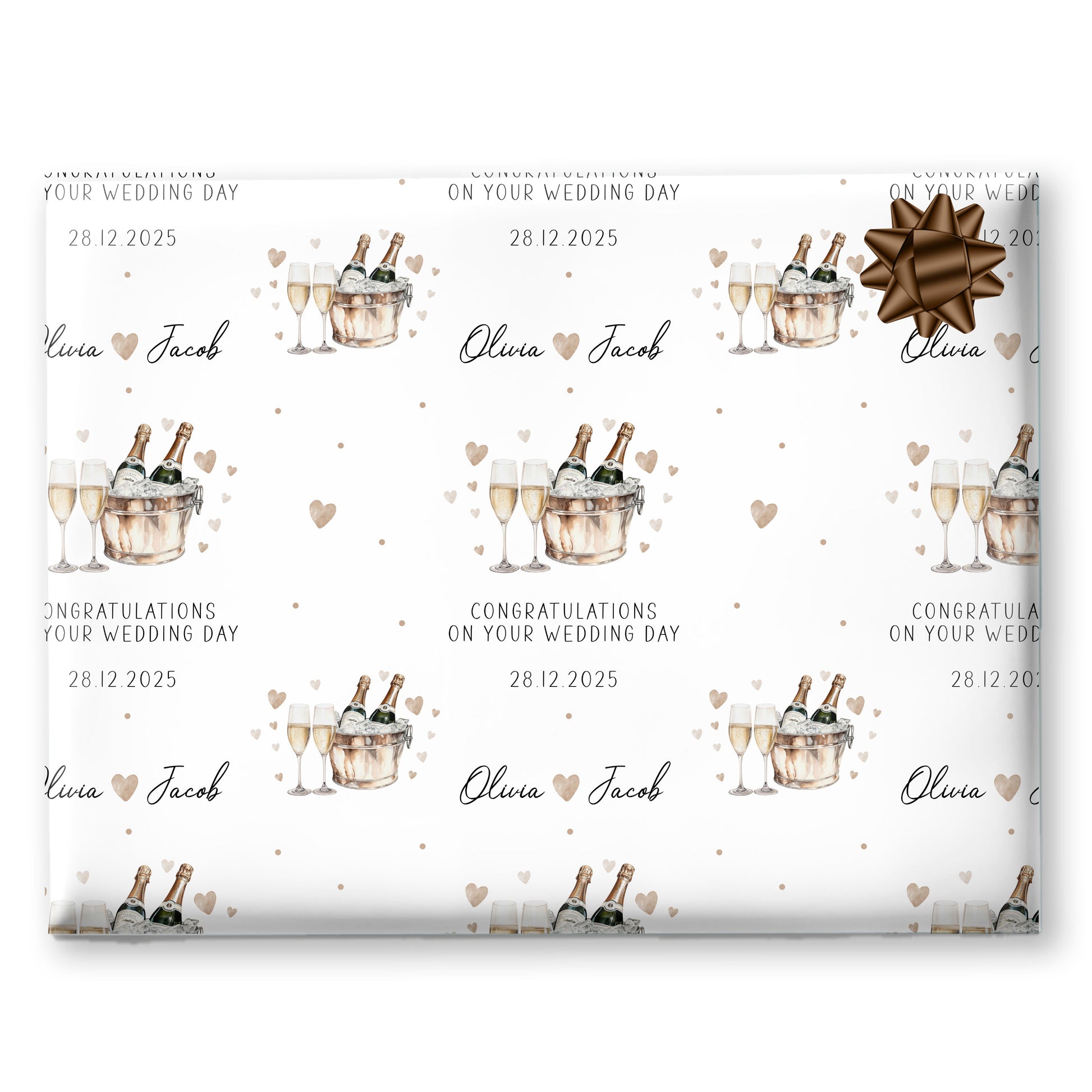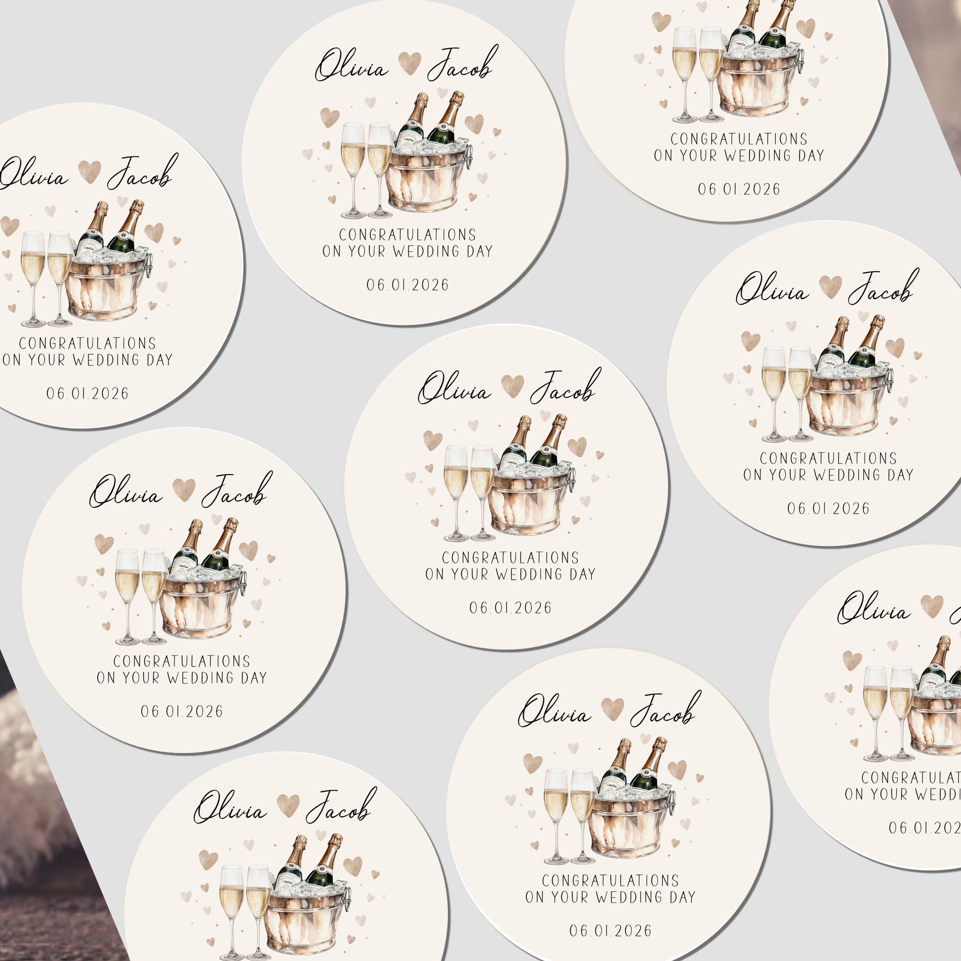 Designed for modern romantics, these luxury gloss stickers feature a delicate champagne bottle and flutes illustration — the perfect finishing touch for wedding favours, welcome bags, gift boxes, or thank-you envelopes. Personalised with the couple’s names and wedding date, they add a beautifully cohesive feel to your big day styling.